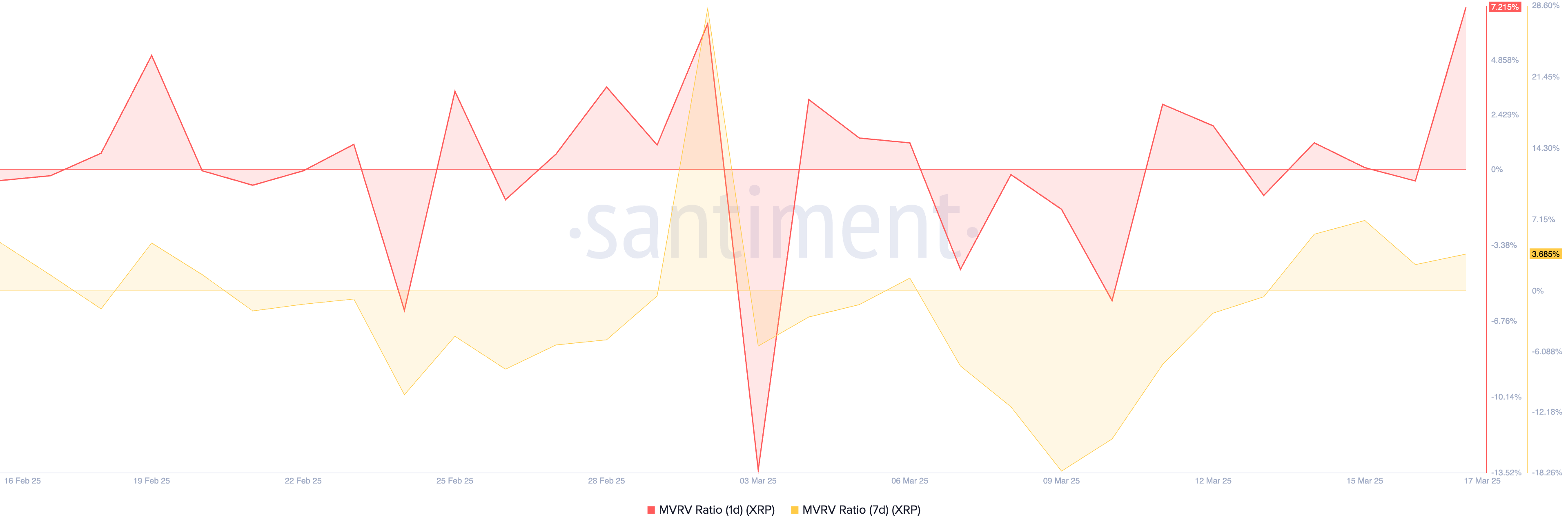 One key indicator flashing warning signs is XRP’s Market Value to Realized Value (MVRV) ratio. This metric, measured using the one-day and seven-day moving averages, currently stands at 7.21% and 3.68%, respectively.