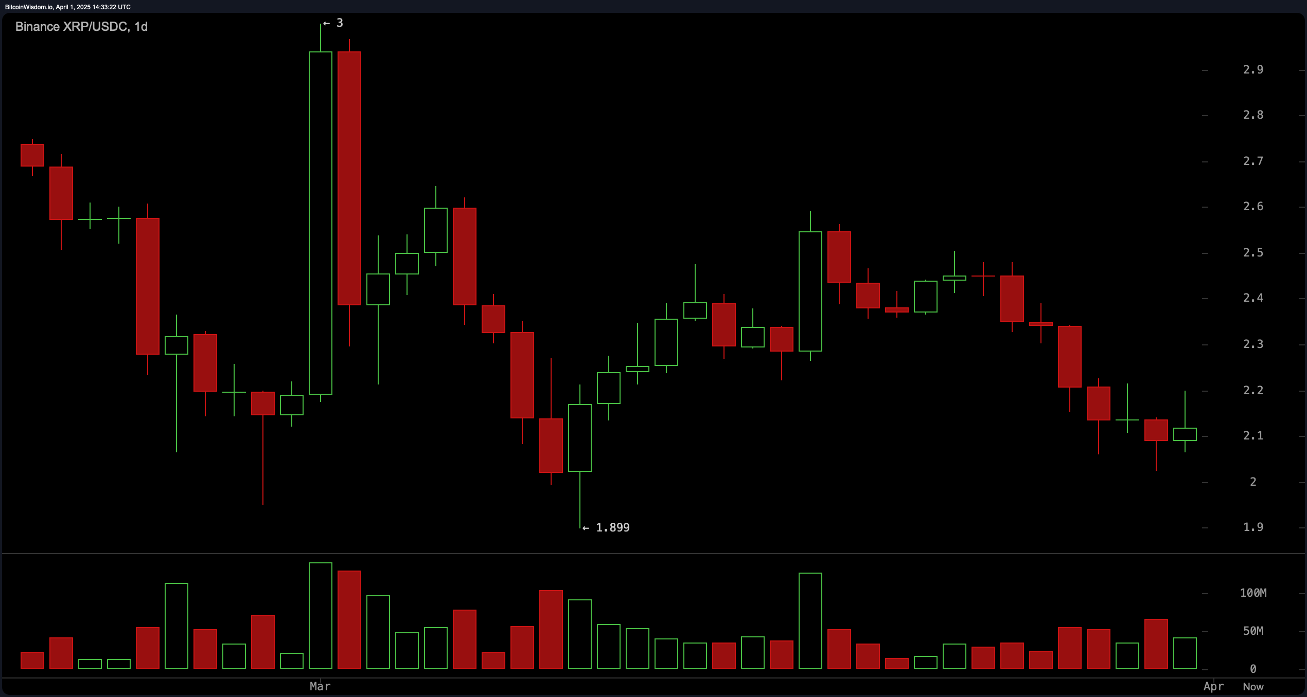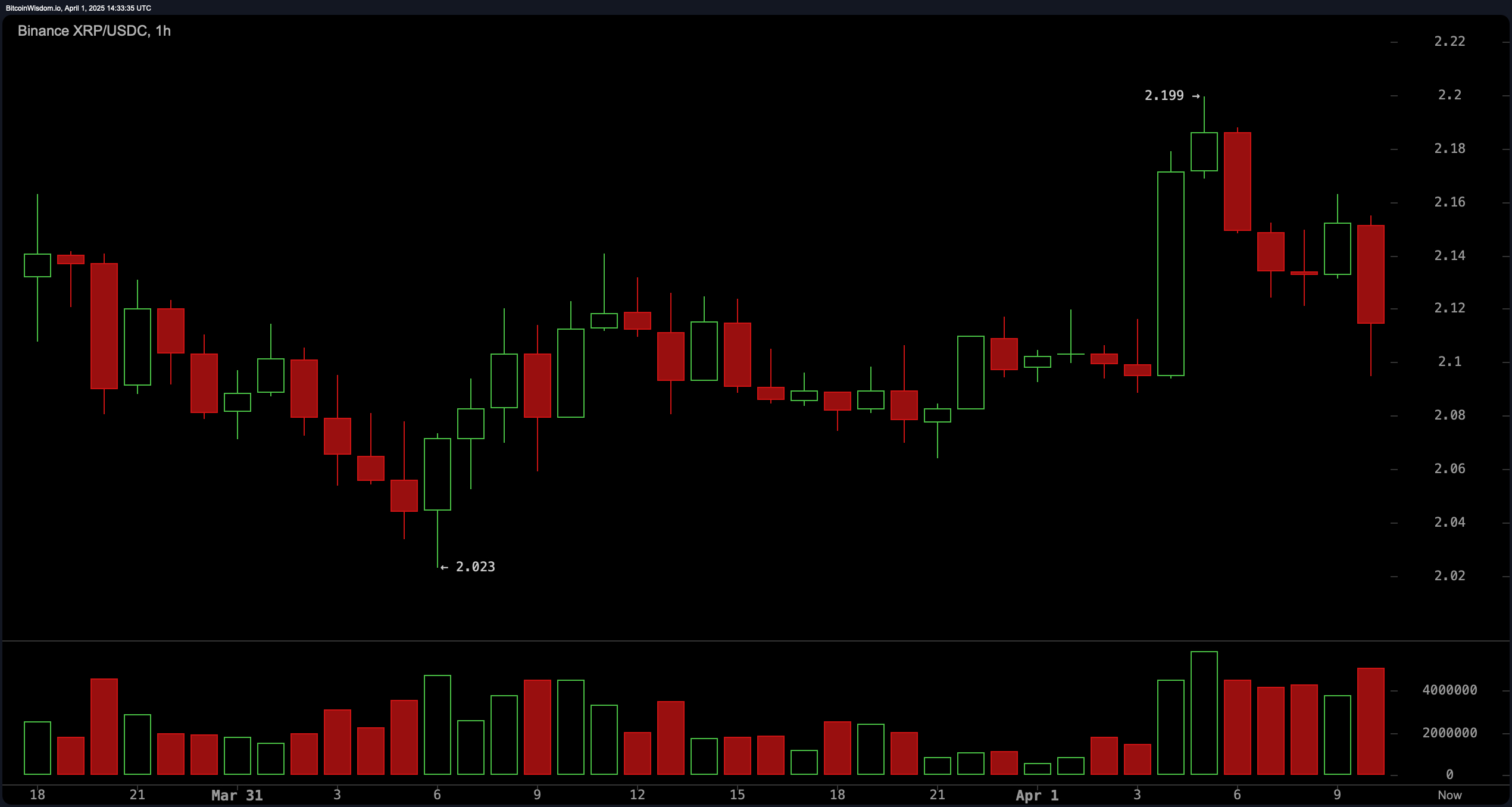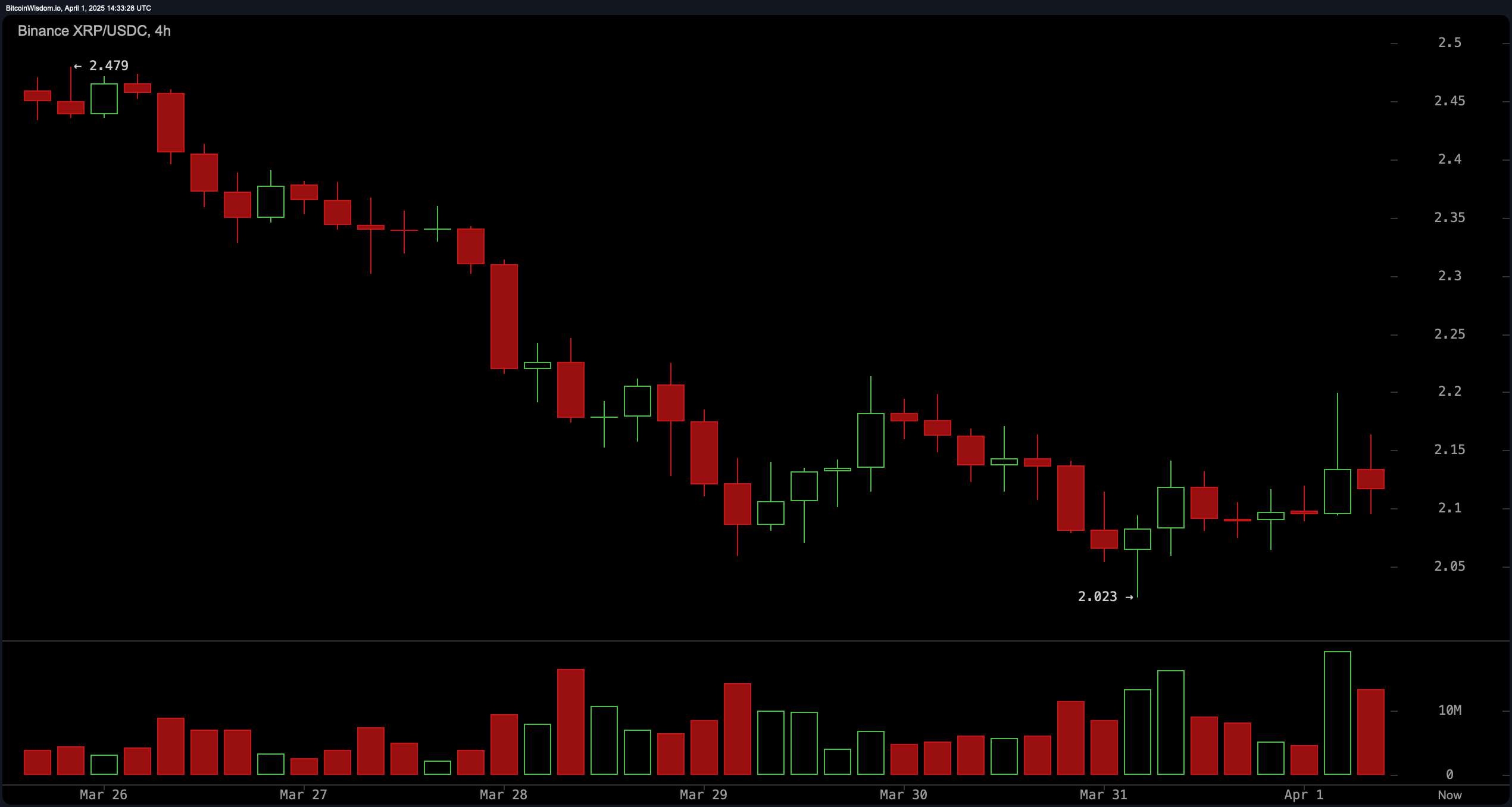 The 4-hour chart portrays XRP in a post-downtrend phase, transitioning into a sideways consolidation pattern. Support has solidified near $2.02, while resistance at $2.15 to $2.20 has capped recent upward attempts. The uptick in volume on bearish candles near resistance suggests potential bull traps, implying sellers might be distributing. Should the price close decisively above $2.20 on strong volume, a short-term bullish breakout toward $2.40 could unfold. However, any failure to maintain the $2.10 level, especially under high-volume selling, may reintroduce downside pressure targeting sub-$2.00 levels.