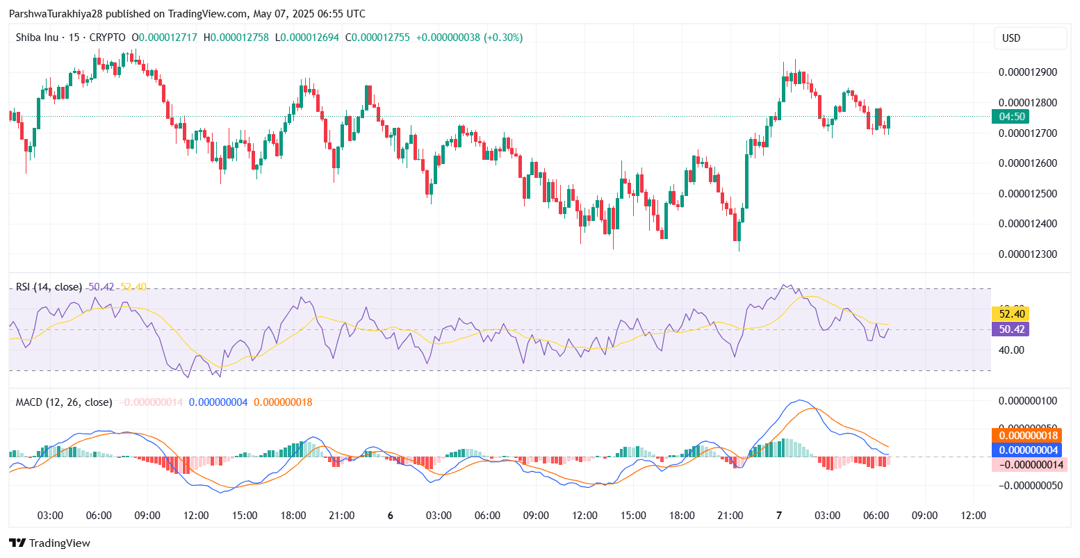 Momentum indicators suggest SHIB is stabilizing but lacks strong bullish conviction. The RSI on the 15-minute and 4-hour charts fluctuates near 52 and 47, respectively—indicating a neutral trend with no overbought or oversold conditions.