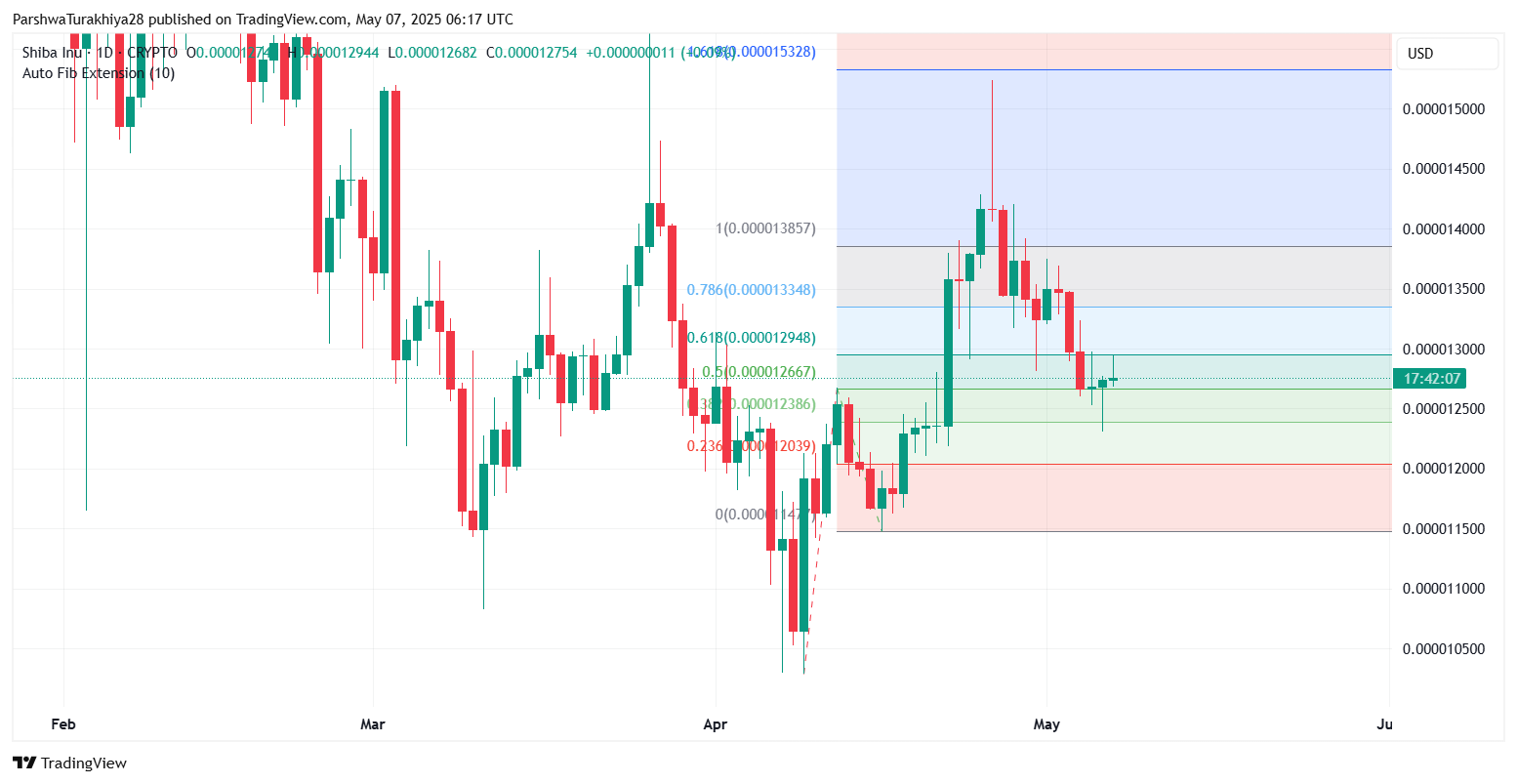 Shiba Inu price lies in the tug-of-war between consolidating bulls and a stacked resistance zone overhead. After a brief dip to $0.00001250, buyers stepped in at the 0.382 Fib support ($0.00001238), initiating a modest rebound. However, the lack of follow-through above $0.00001294 is limiting upside traction.