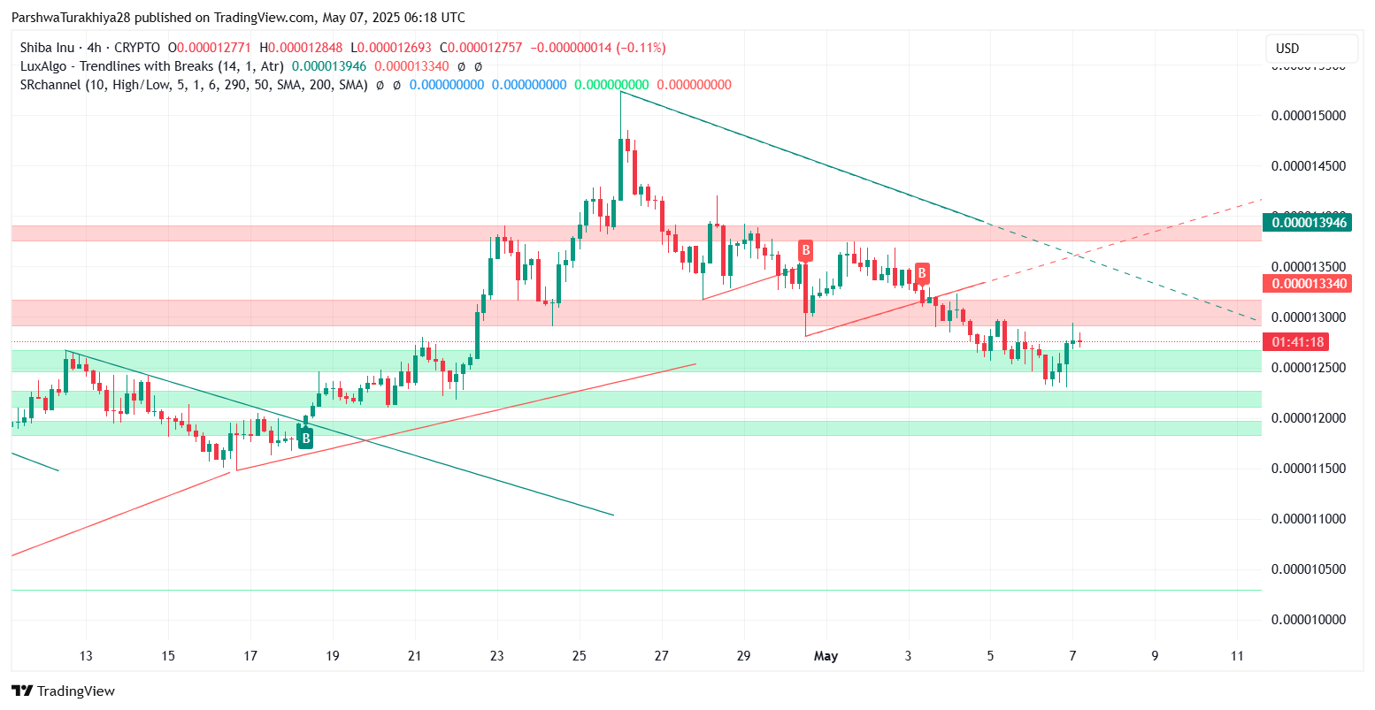 On the 4-hour chart, SHIB is approaching a descending resistance trendline that has constrained price action since late April. The asset remains range-bound between $0.00001240 and $0.00001335. Price is also wrestling with the 50-EMA on this timeframe ($0.00001302), which coincides with a horizontal resistance band. Unless bulls secure a firm breakout above this confluence zone, the trend bias remains neutral.