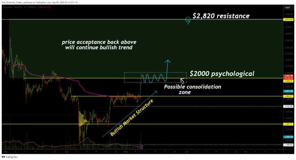 After weeks of range-bound consolidation, Ethereum (ETH) has finally broken through the highly contested $2,000 resistance. This level has acted as a psychological ceiling for several months, and reclaiming it marks a significant shift in short-term market structure. The move was triggered by a strong reaction at the $1,800 support zone, and now all eyes are on the next major resistance level at $2,820.