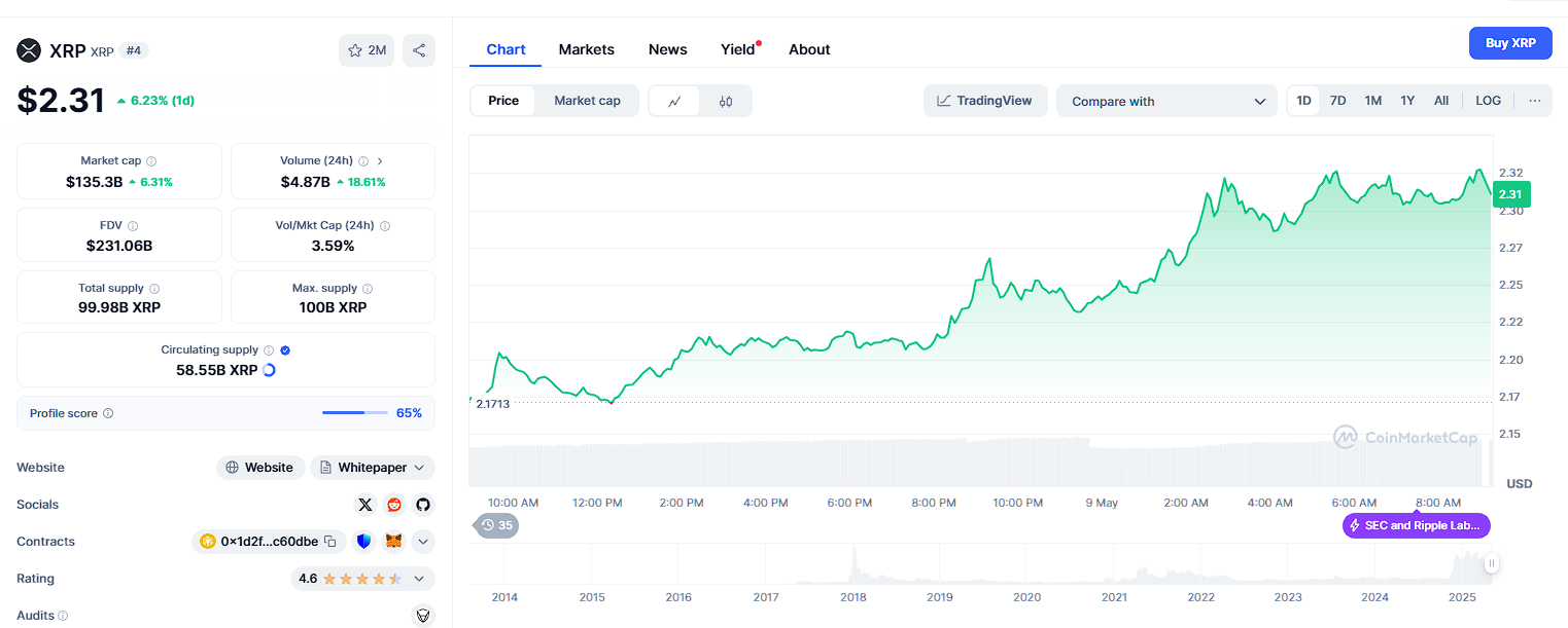 After a brief dip earlier in the trading session (potentially near $2.11, according to some charts like CoinMarketCap), XRP reversed course sharply on strong buying interest. The price then pushed through previous resistance levels, establishing a new higher high around $2.30.