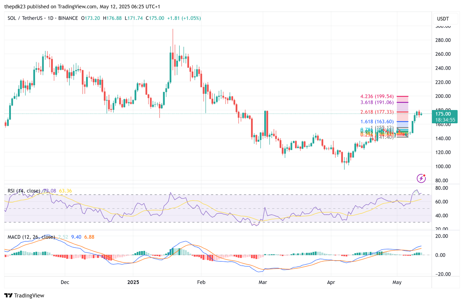 On the daily chart, Solana displays strong bullish momentum. Fibonacci Extensions suggest possible targets at $177.33 (2.618 level), which is currently being tested. Other resistances include $191.06 (3.618 level) and $199.54 (4.236 level).
