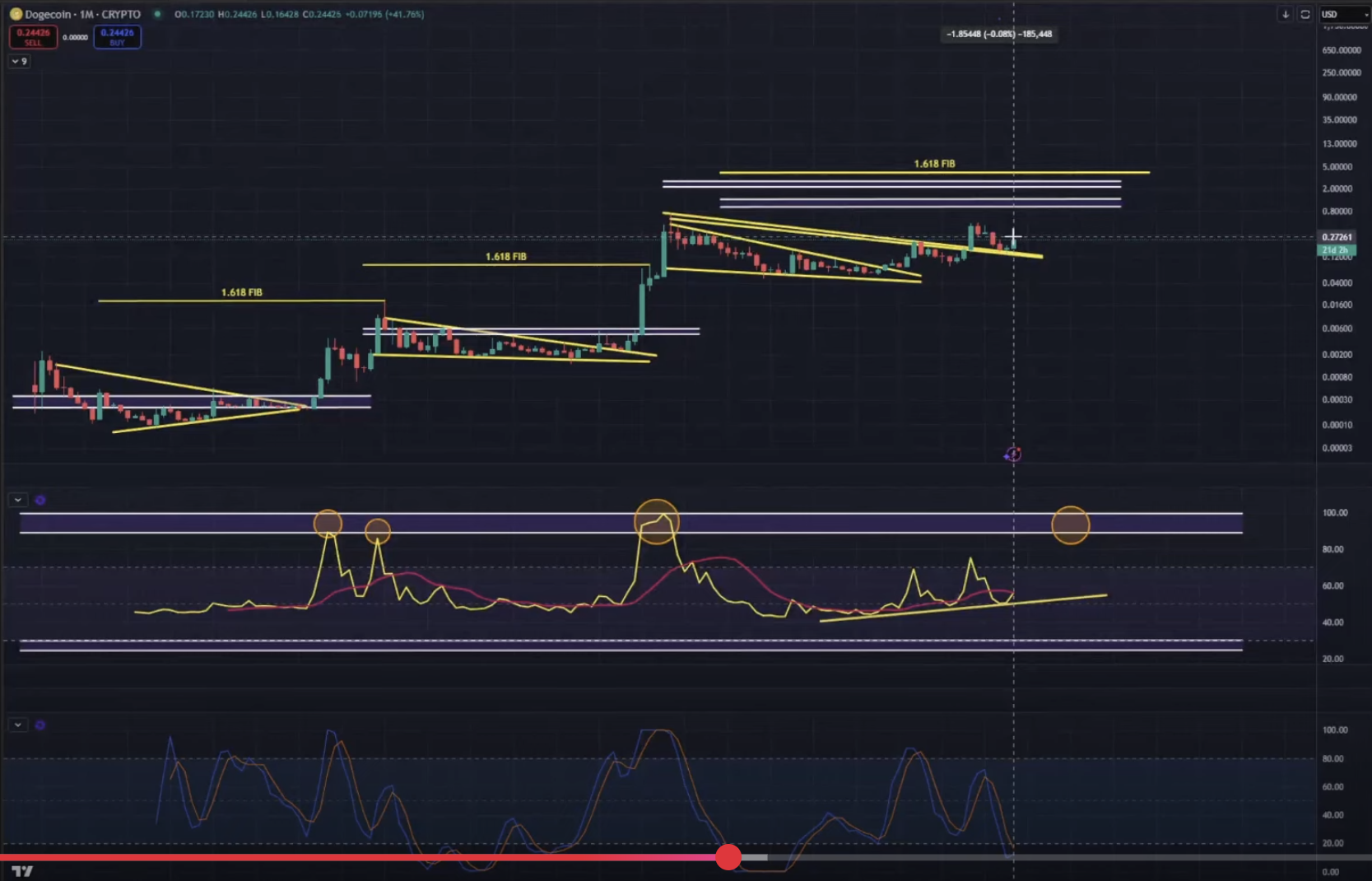 “Can Dogecoin hit $1 this cycle? The answer is yes, it absolutely can,” Kevin told his followers at the outset of the video. He argued that Dogecoin is now in its third major cycle and has historically advanced to the 1.618 Fibonacci extension on the monthly chart. That extension currently sits at roughly $3.80, “well above a dollar,” he noted, while stressing that citing the level is “not a price call” but a way to frame upside potential.