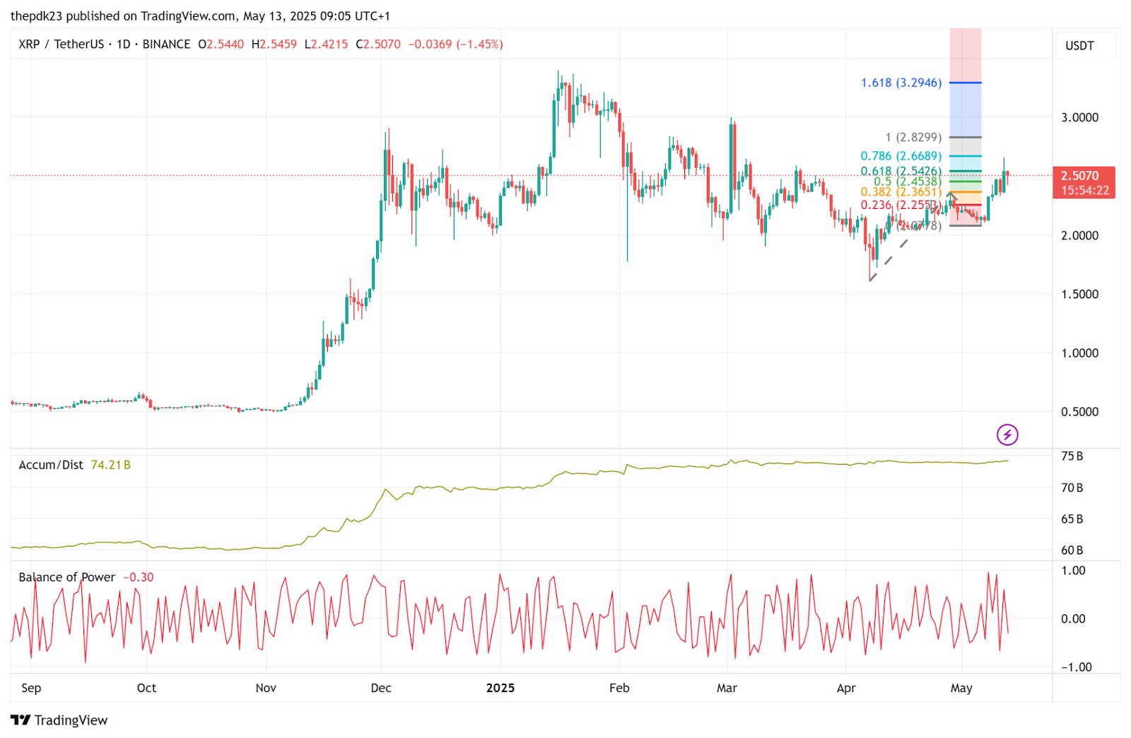 A Fibonacci retracement applied to XRP’s most recent upward move highlights that XRP is currently testing resistance at the 0.618 level ($2.54), which aligns with today’s local high.