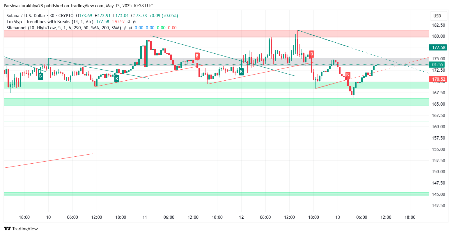 Price is currently pressing against the upper boundary of a descending triangle visible on both 30-minute and 4-hour charts. While this breakout attempt looks promising, a clean close above $177 will be needed to confirm a short-term trend reversal.