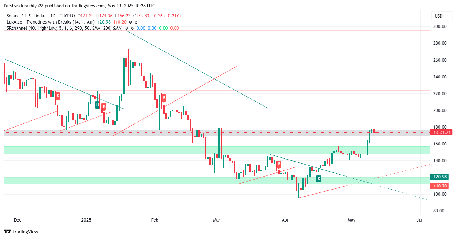 Solana price surged in early May, reaching as high as $181 before cooling off. The correction saw prices slide to $166 on May 12, aligning with a key support cluster just above the 50 EMA. This dip attracted buyers, leading to a rebound that is now testing the descending trendline once again.