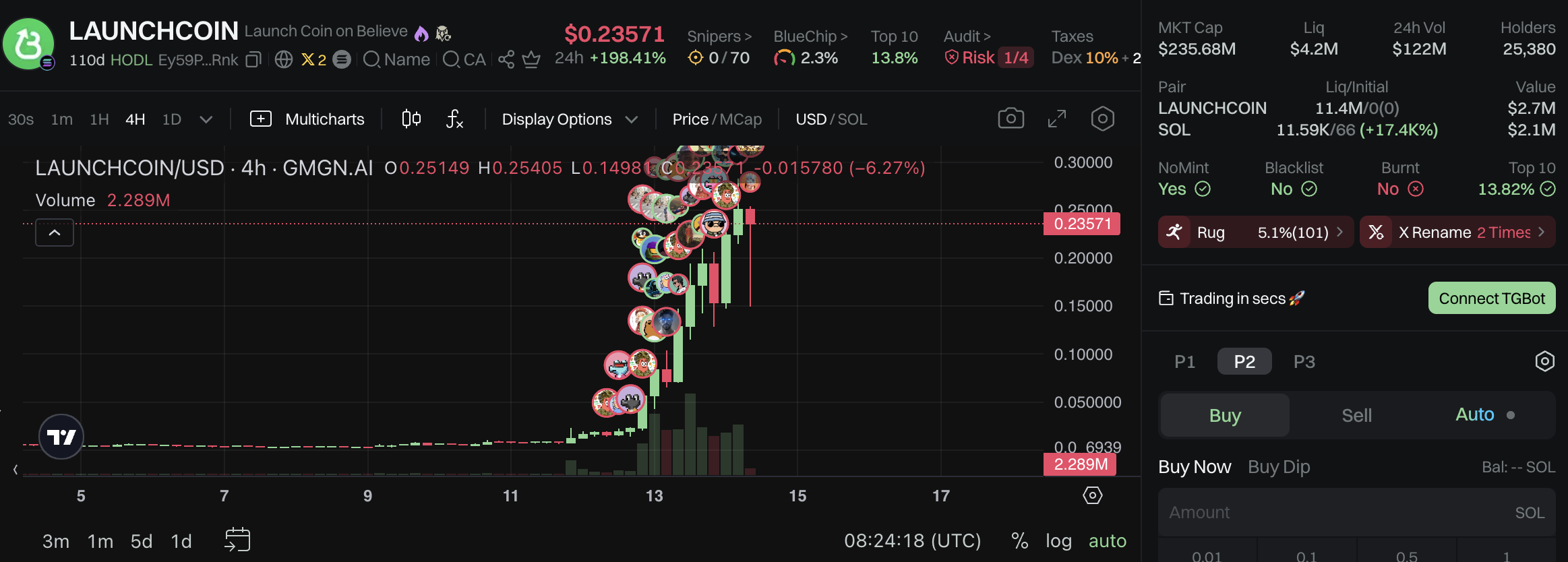 Data from GMGN reveals that LAUNCHCOIN’s liquidity remains low, with only $4.2 million in the liquidity pool, while its market capitalization has soared past $230 million. This discrepancy could make it challenging for investors to sell large tokens, leading to potential slippage risks.