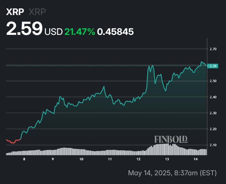 Over the last seven days, XRP has broken above the critical $2.50 zone, gaining 21.47% on the weekly chart to trade at $2.59 as of May 14.
