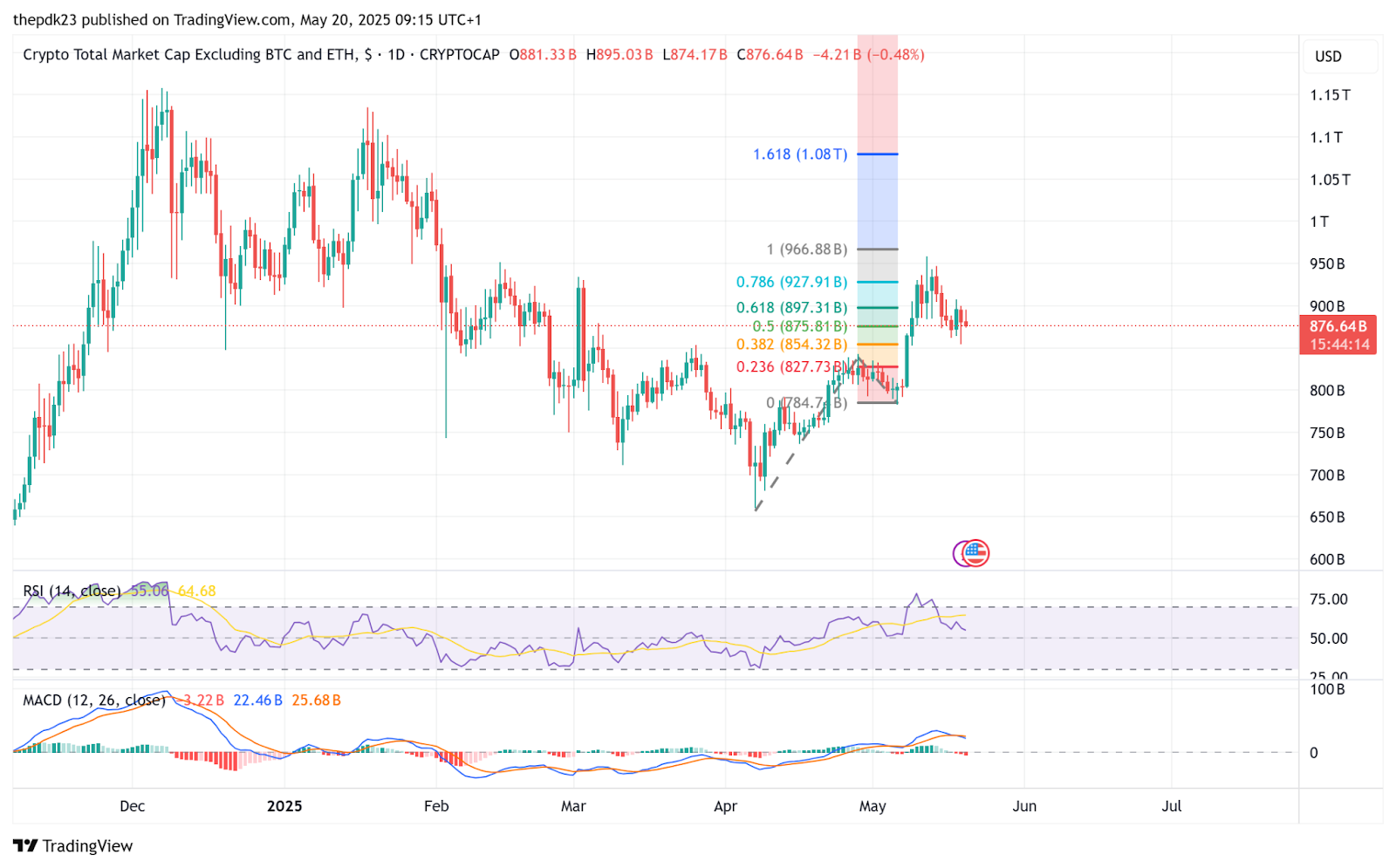 The Relative Strength Index (RSI) hovers around 55, just above neutral. It previously hit a local high near 65, indicating bullish strength but also hinting at short-term exhaustion. A move above 60–65 could signal renewed momentum and a breakout toward $966 billion and potentially the 1.618 Fib extension at $1.08 trillion