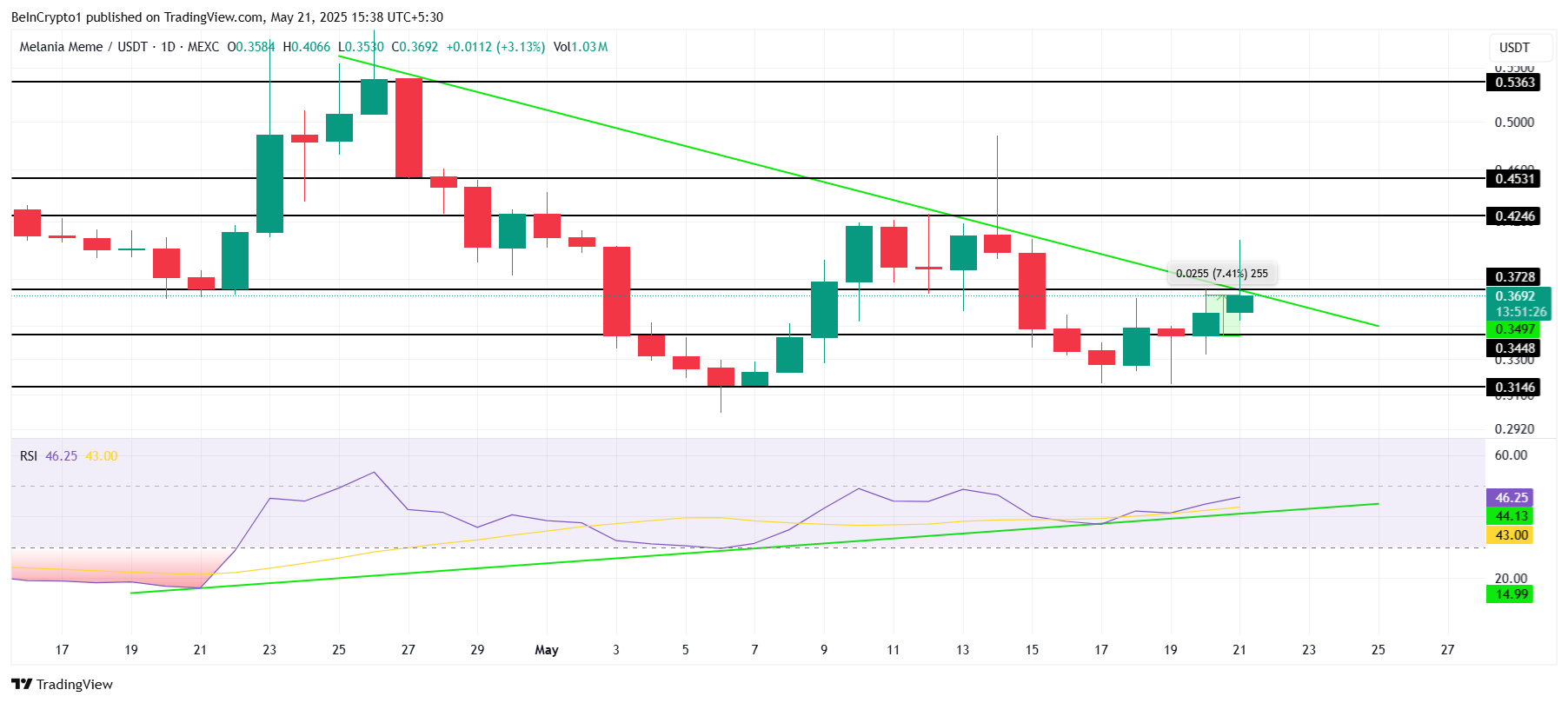 The meme coin is forming a bullish RSI divergence, which signals potential upward movement. This suggests MELANIA could break the $0.37 resistance level, continuing its rise and possibly reaching $0.42. The price action indicates growing optimism among investors, who expect further upward momentum based on recent trends.