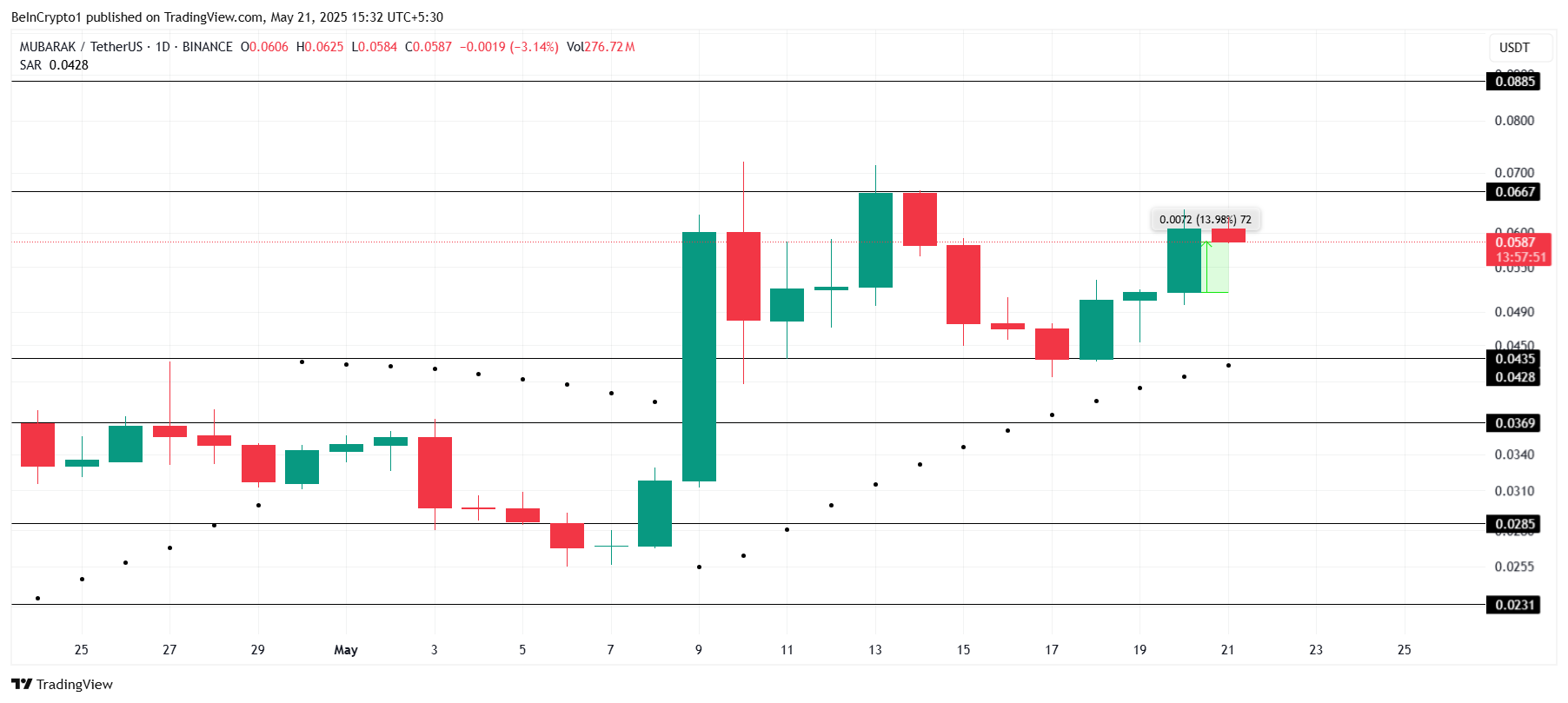 MUBARAK price is up by 14% over the last 24 hours, preparing to breach the critical $0.0667 resistance level. The Parabolic SAR indicator positioned below the candlesticks provides a bullish outlook for the meme coin, suggesting that upward momentum could continue as it approaches the key resistance.