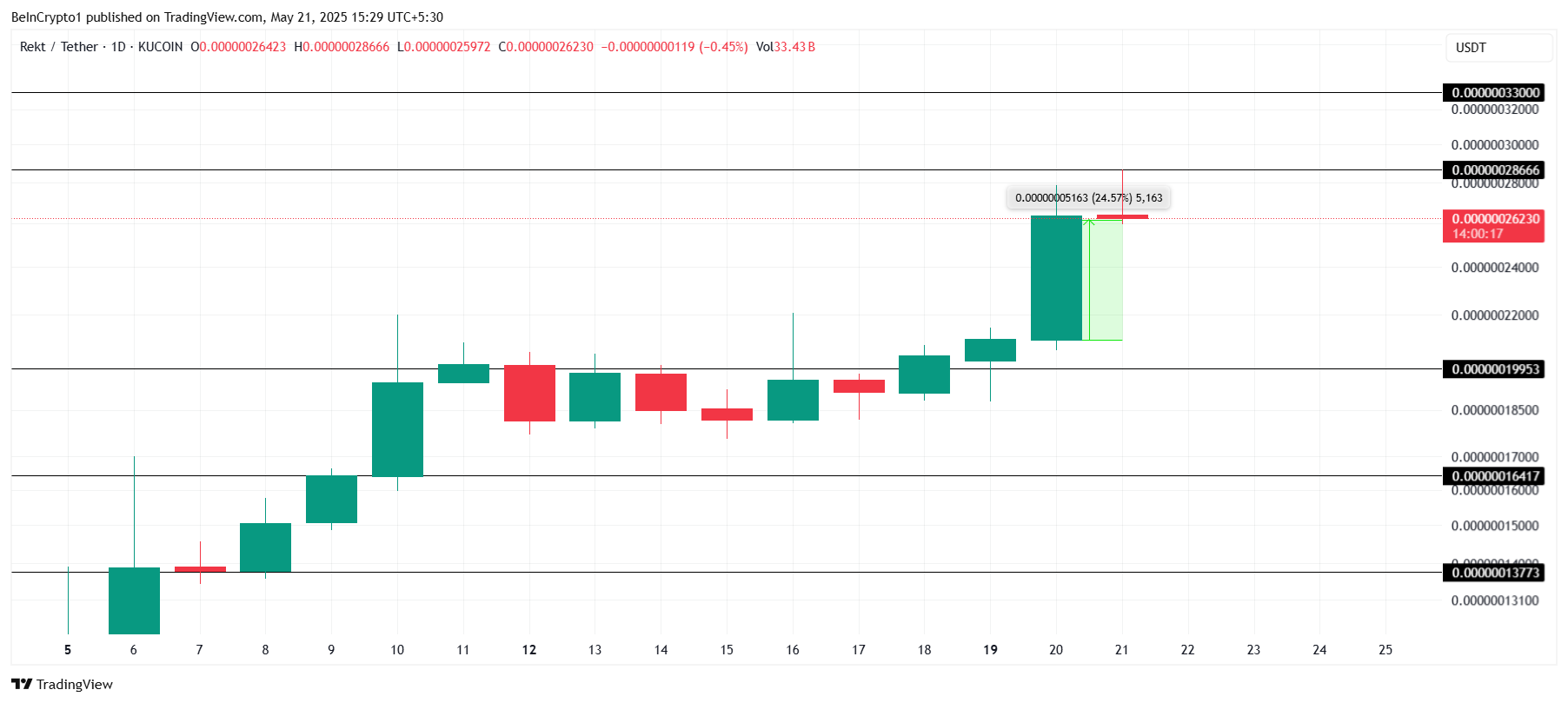 The strong backing from investors is essential for REKT’s upward movement. Currently facing resistance at $0.000000286, breaching this level will allow the meme coin to move toward $0.000000330. A successful breakout above this resistance will likely drive further investor confidence and fuel the ongoing bullish trend.