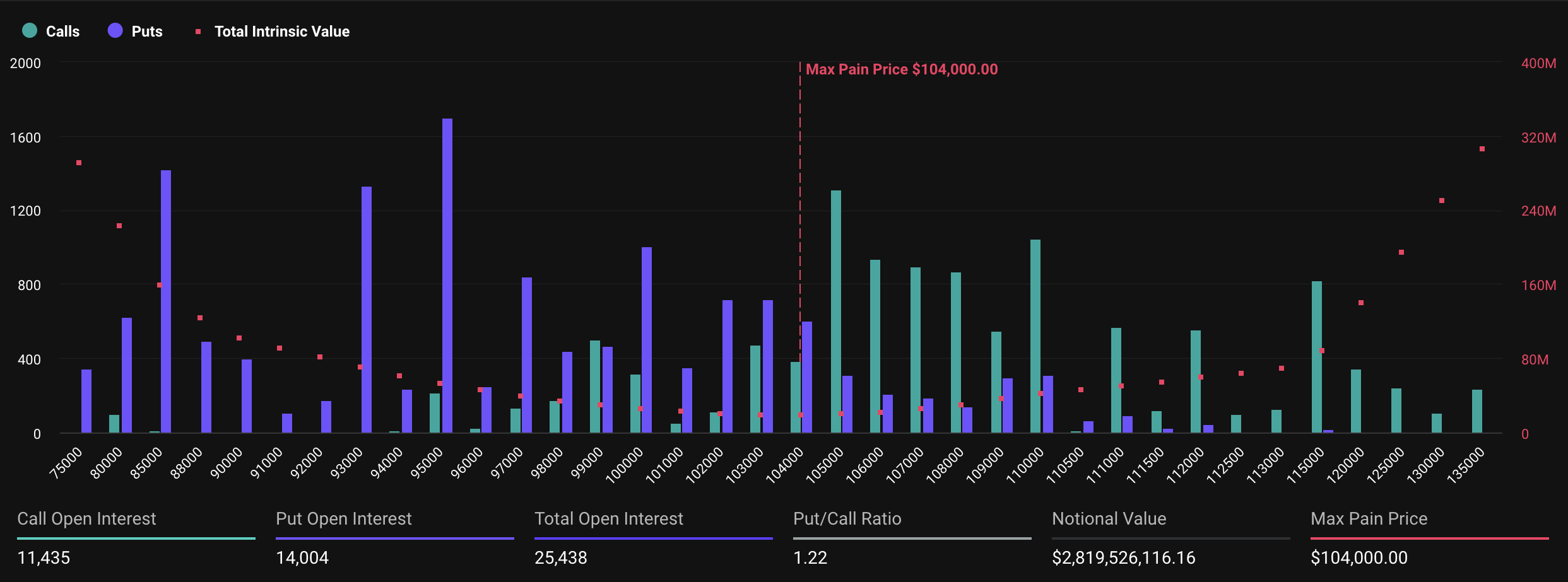 For Bitcoin, the max pain price is $104,000. At the time of writing, BTC was trading at $110,787. It reached an all-time high of $111,917 yesterday but has since slipped around 1.0% from its peak.