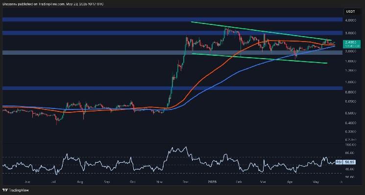 Conversely, a breakdown below $2 would invalidate the structure and likely lead to a drop toward the lower boundary of the channel near the $1.5 mark.