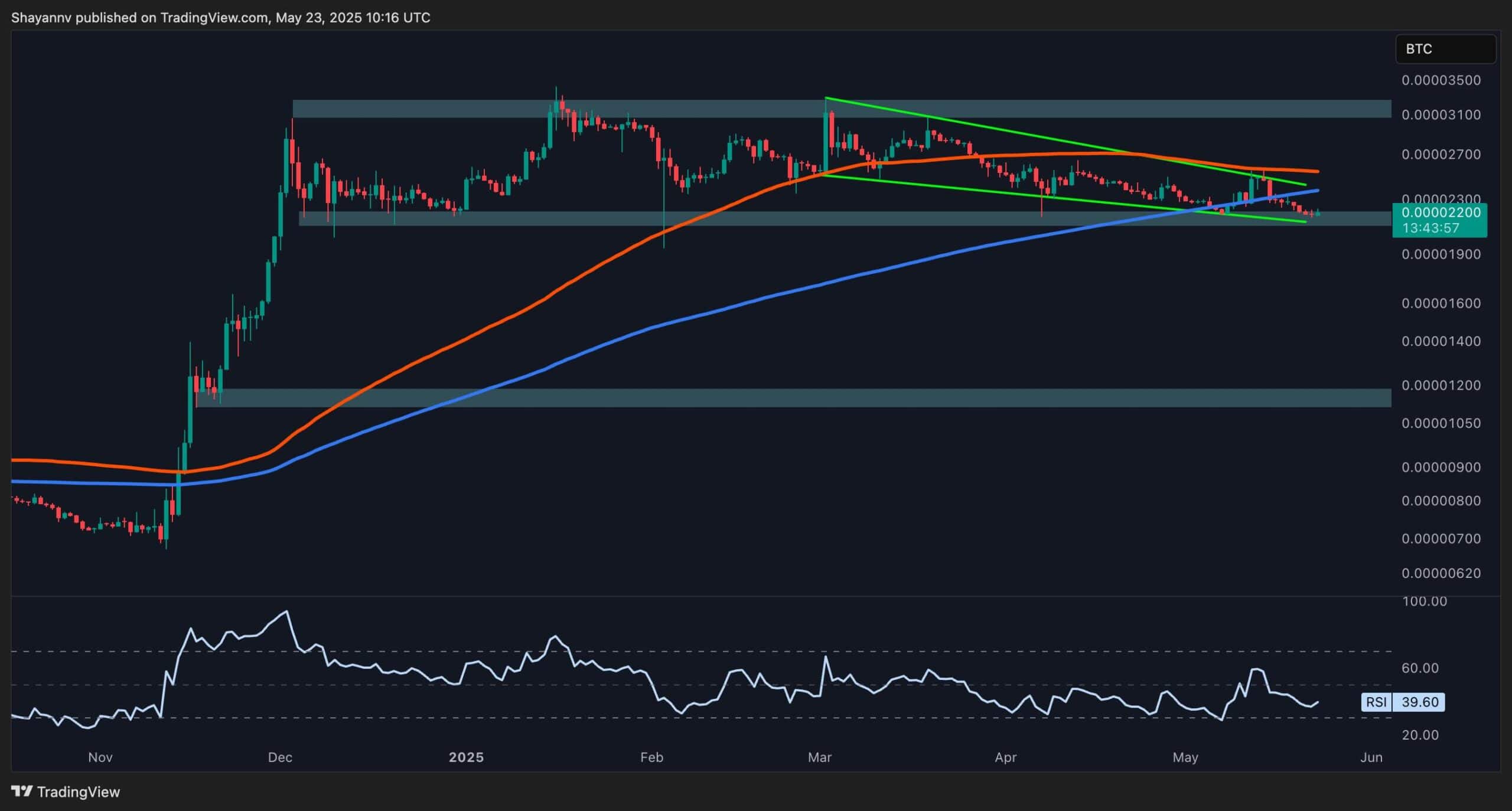 This setup reflects a bearish bias unless bulls can reclaim 2400 SAT and push out of the descending channel and above the moving averages. The momentum is also clearly weakening, as reflected by the RSI sitting near 40, indicating a lack of bullish strength. If 2200 SAT is lost, XRP/BTC could quickly slide to the 1600-1800 SAT range, which is the next visible demand zone.
