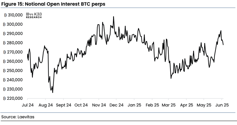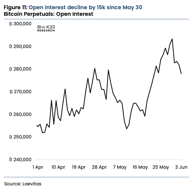 Overall, the derivatives environment has gotten a bit of a chill despite us heading into summer, with analyst Vetle Lunde noting that the perpetual future open interest dropped by 15,000 bitcoin since the end of May. The silver lining here, though, is that overall we’re seeing open interest remain near April highs at 278,000 BTC.