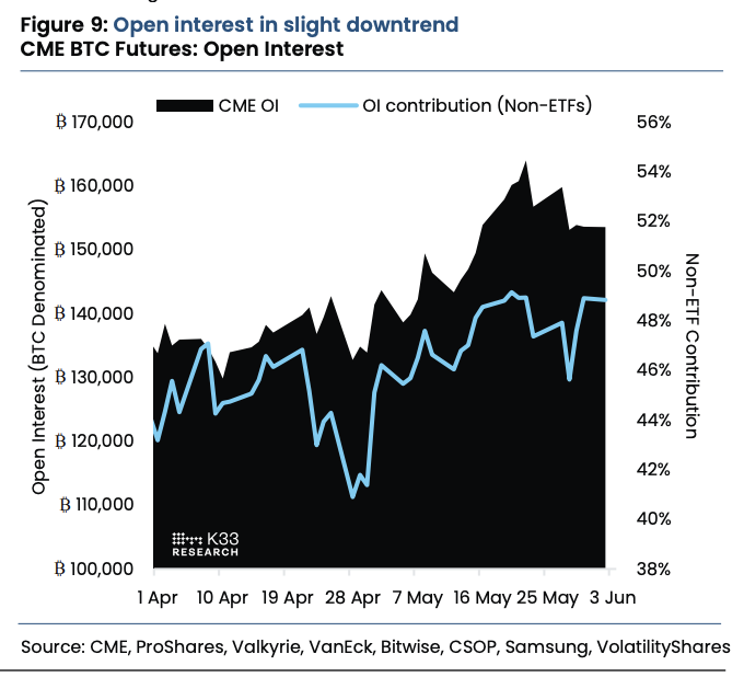 K33 noted that CME exposure has “risen modestly,” but it’s nowhere near its previous peaks.