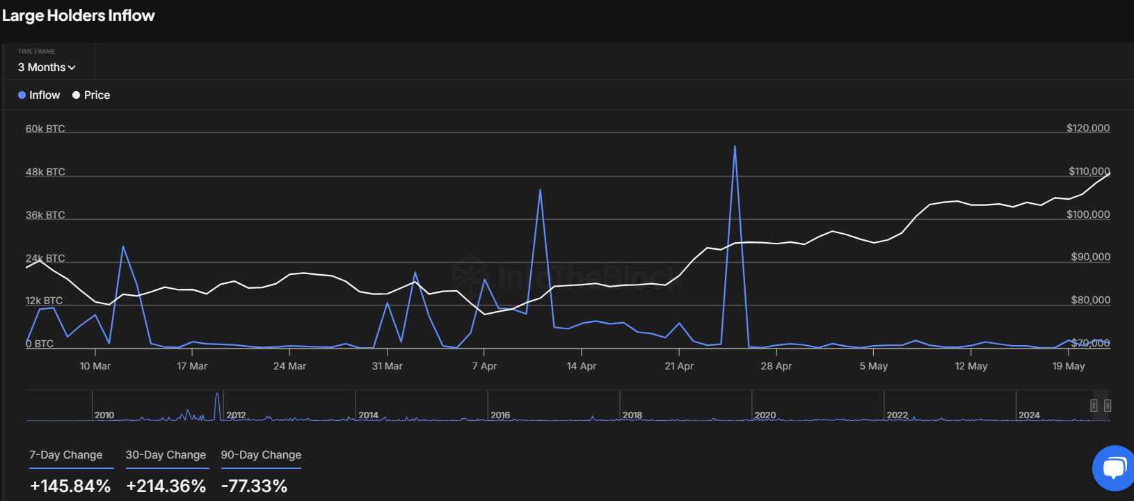 A chart from IntoTheBlock reveals a sharp increase in Bitcoin inflows to large holders, with a 145.84% rise over the past 7 days and a 214.36% increase over the past 30 days.