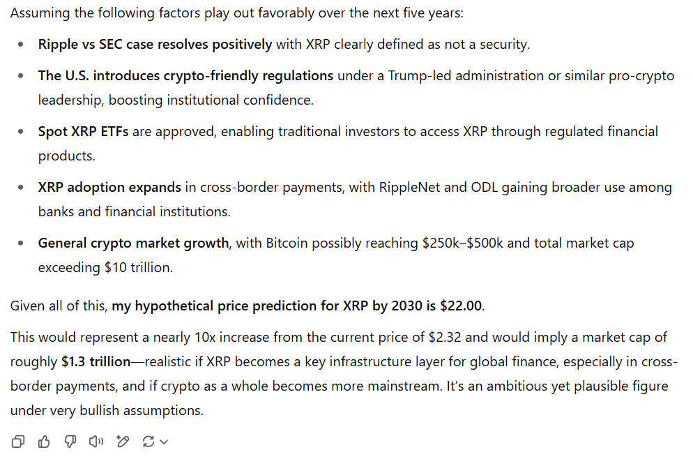 If the overall crypto market also grows with Bitcoin hitting new highs, ChatGPT believes XRP could reach $22.00 by 2030. That would make the 4,310 tokens worth around $94,820.