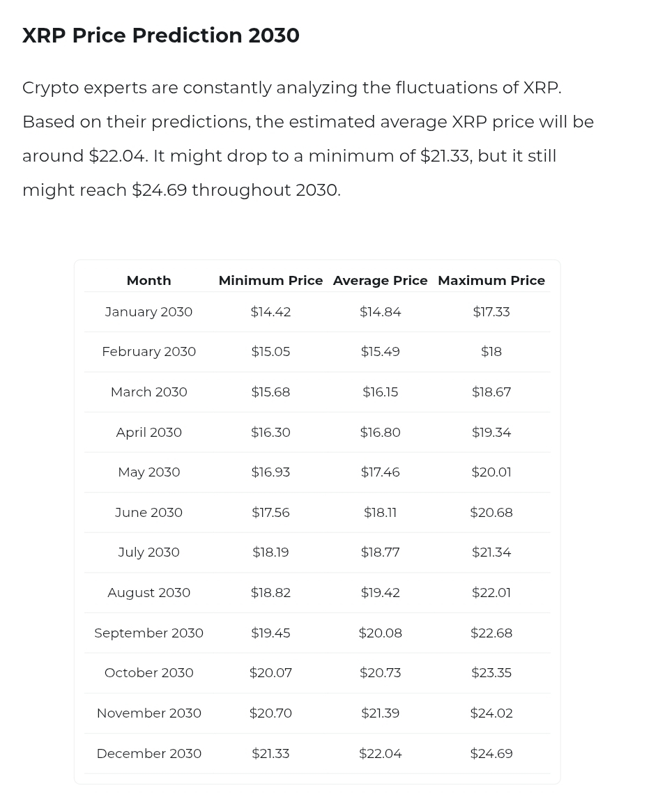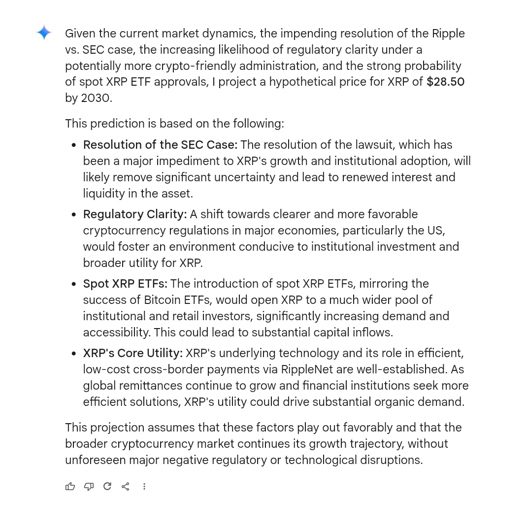 Notably, Google Gemini’s forecast for XRP is quite optimistic. The AI model sees the token climbing to $28.50 by 2030.
