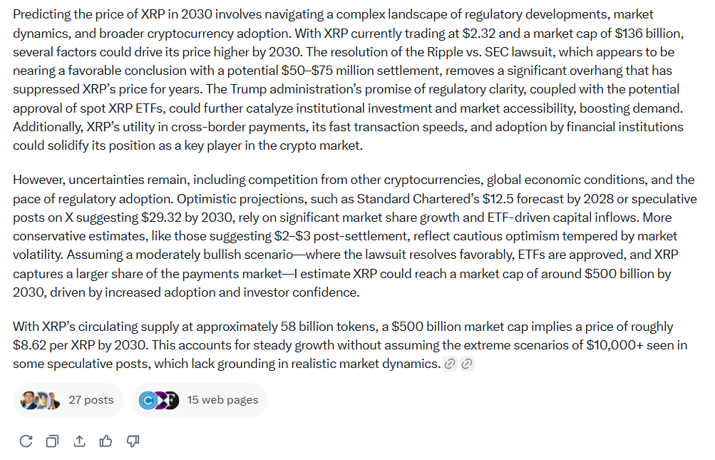 Meanwhile, Grok AI also gave its take. It mentioned the likely end of the Ripple-SEC legal battle and the growing chance of more supportive crypto rules under a pro-crypto administration.