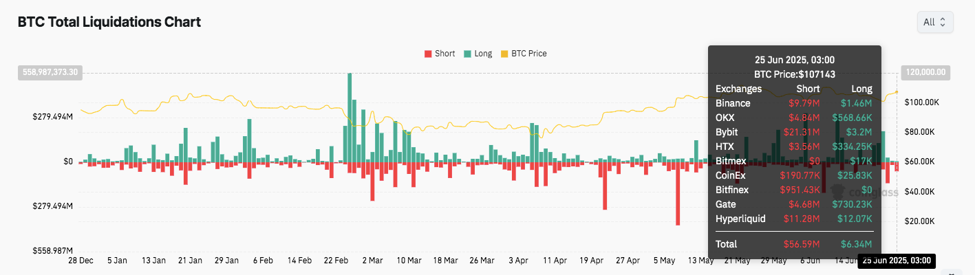 Significantly, liquidation data reflects aggressive market reactions. As of June 25, over $56 million in short positions were liquidated, compared to only $6.34 million in longs.