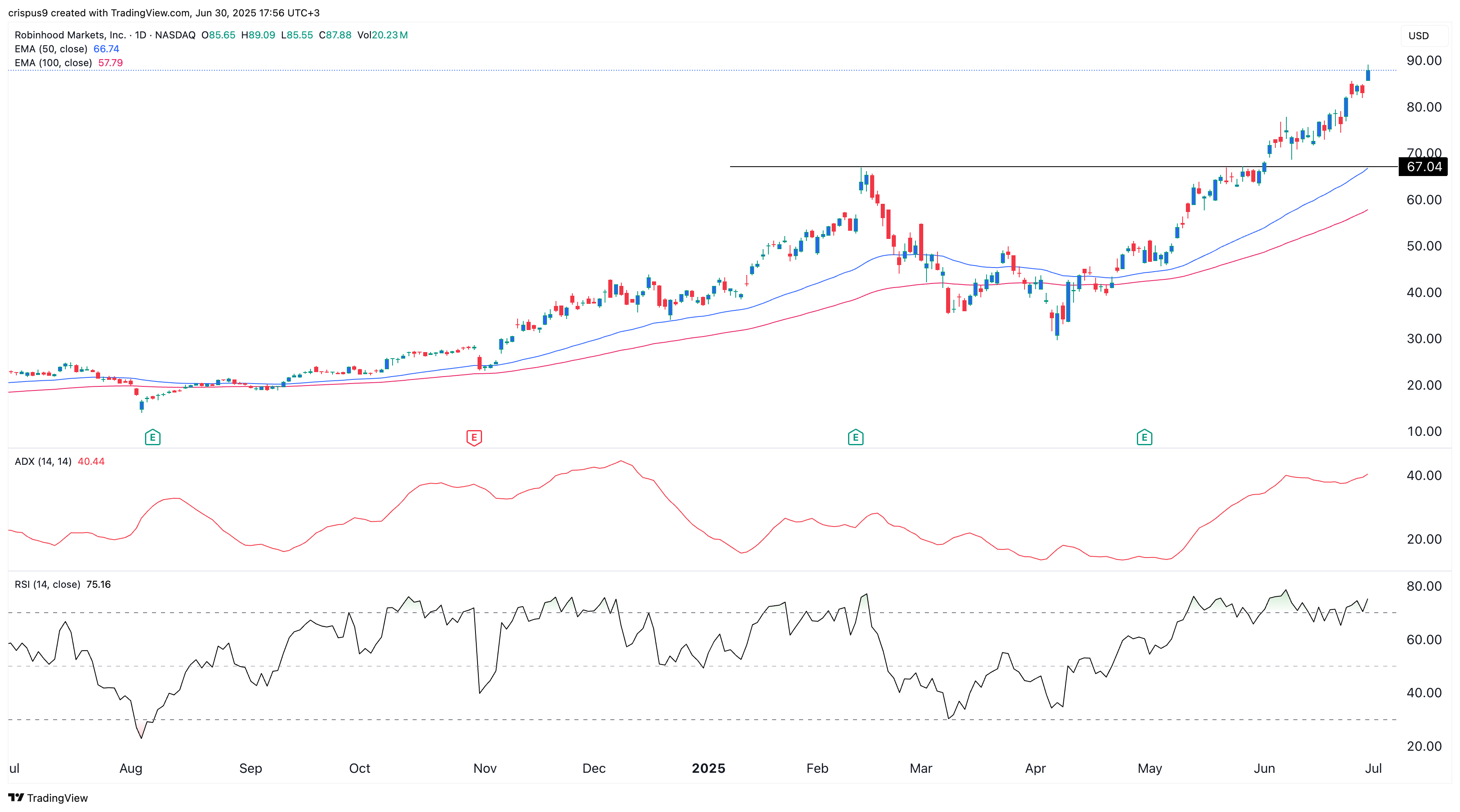 The daily chart shows that HOOD stock has been in a strong bull run and is now hovering near its all-time high. It has jumped above a key resistance level at $67, the highest swing from February.