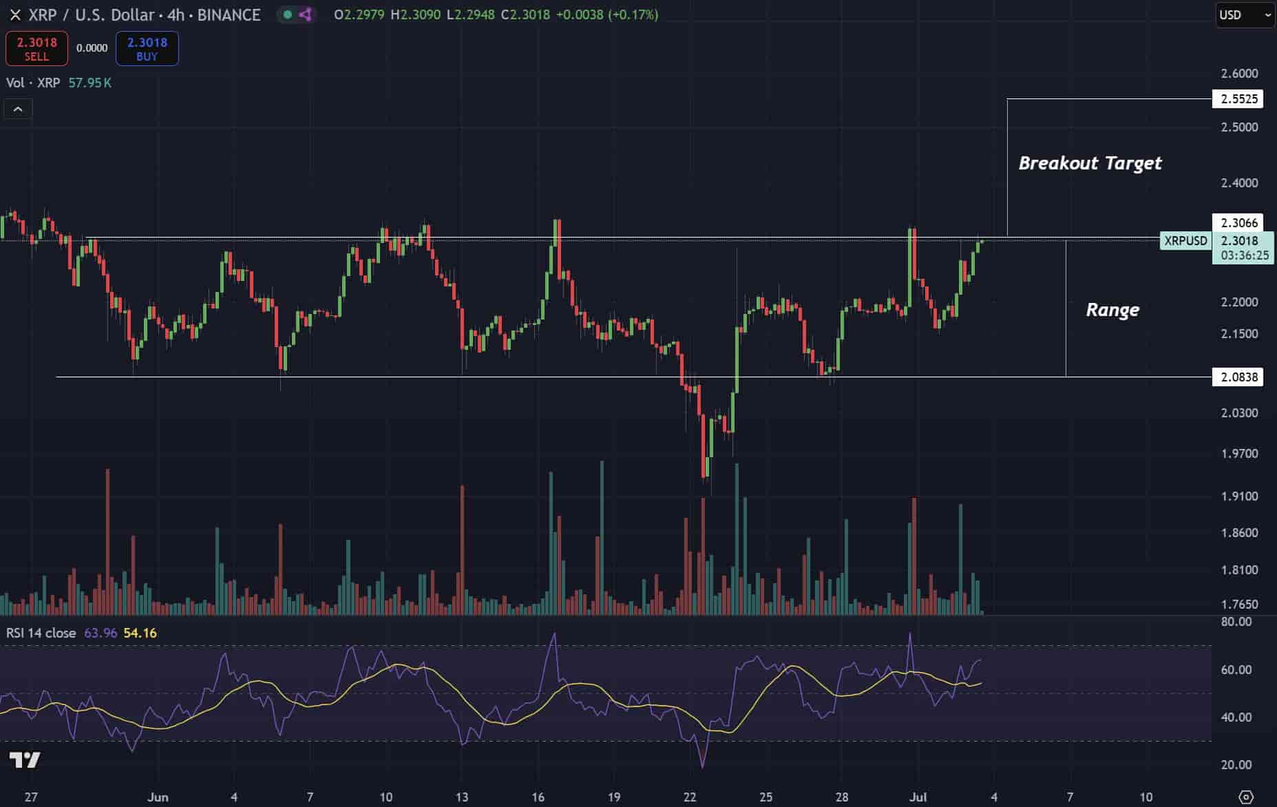 Technical signals are also aligning. On the 4-hour chart, XRP is attempting to break through horizontal resistance near $2.30, with a breakout target of $2.55 in sight. The RSI sits just above 63, suggesting strong momentum but not yet overbought, a potentially bullish setup.