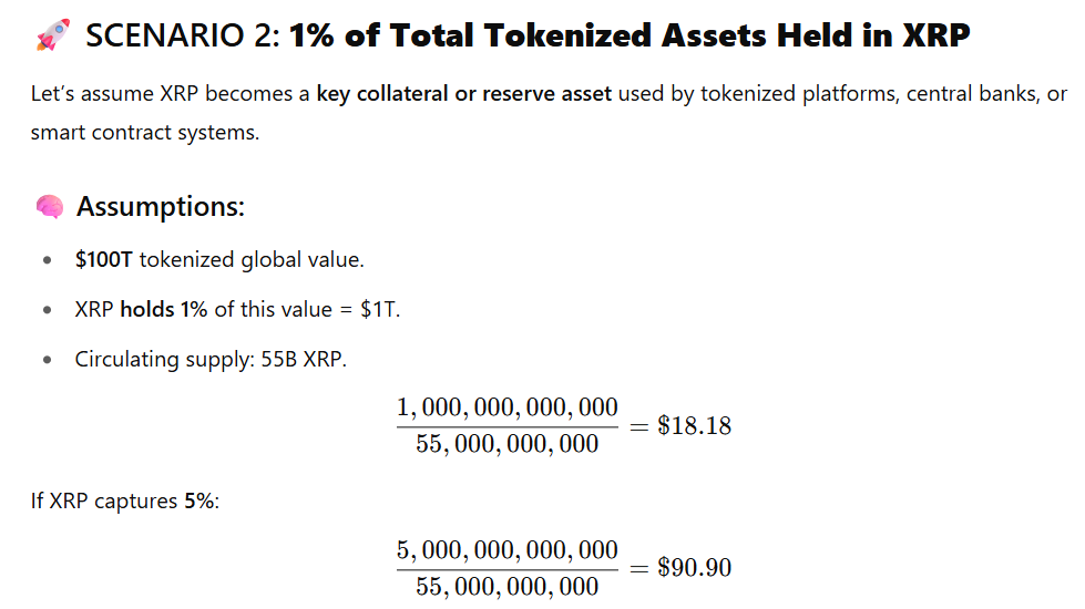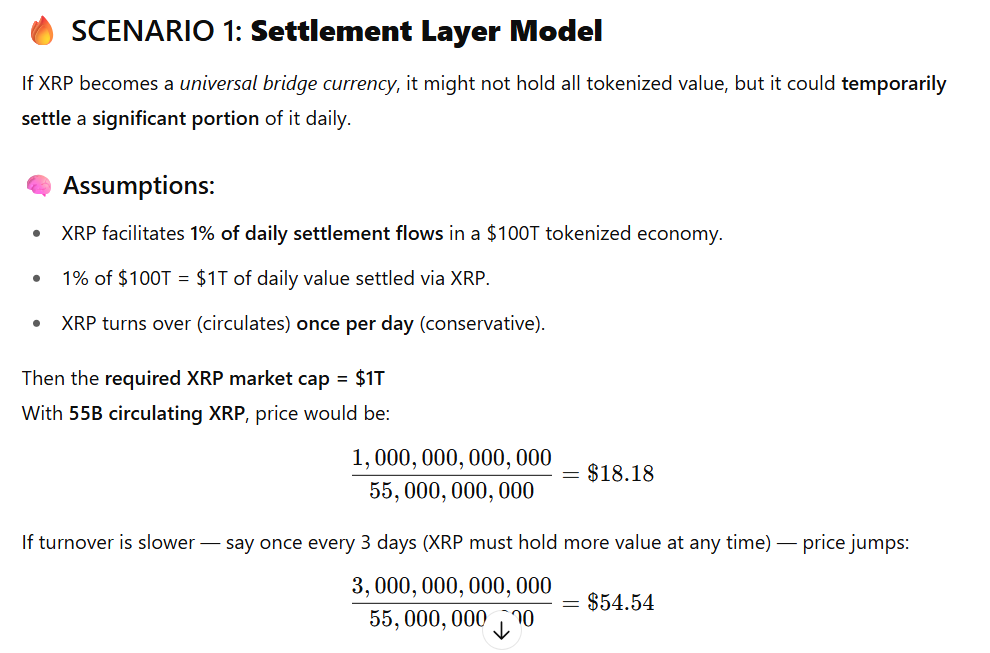 Responding, ChatGPT presented two major scenarios. In the first, XRP acts as a settlement layer. With this scenario, ChatGPT assumed a $100 trillion worth of tokenized global economy.
