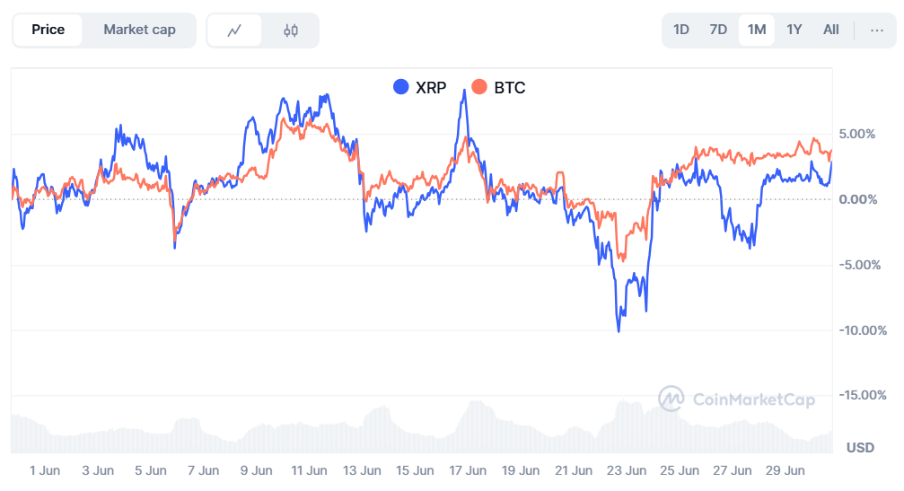 Interestingly, data from CoinMarketCap confirms this pattern. Market data indicates that XRP has trailed Bitcoin’s direction over the past month, except for a slight deviation from June 25 to 28, when XRP collapsed but Bitcoin displayed greater resilience to bearish pressure. However, currently, both coins are again moving alongside each other.