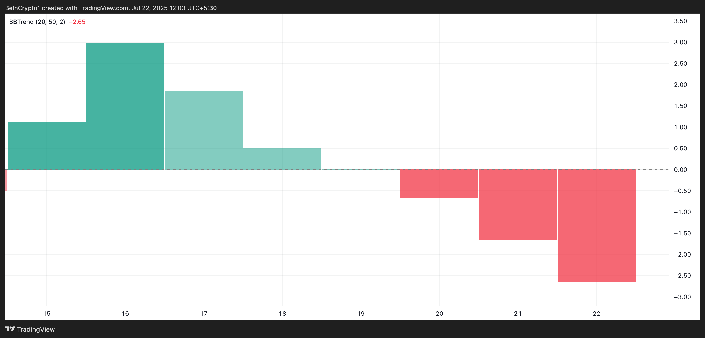 The BBTrend measures the strength and direction of a trend based on the expansion and contraction of Bollinger Bands. When it returns red bars, the asset’s price consistently closes near the lower Bollinger Band, reflecting sustained selling pressure and hinting at the potential for further downside.
