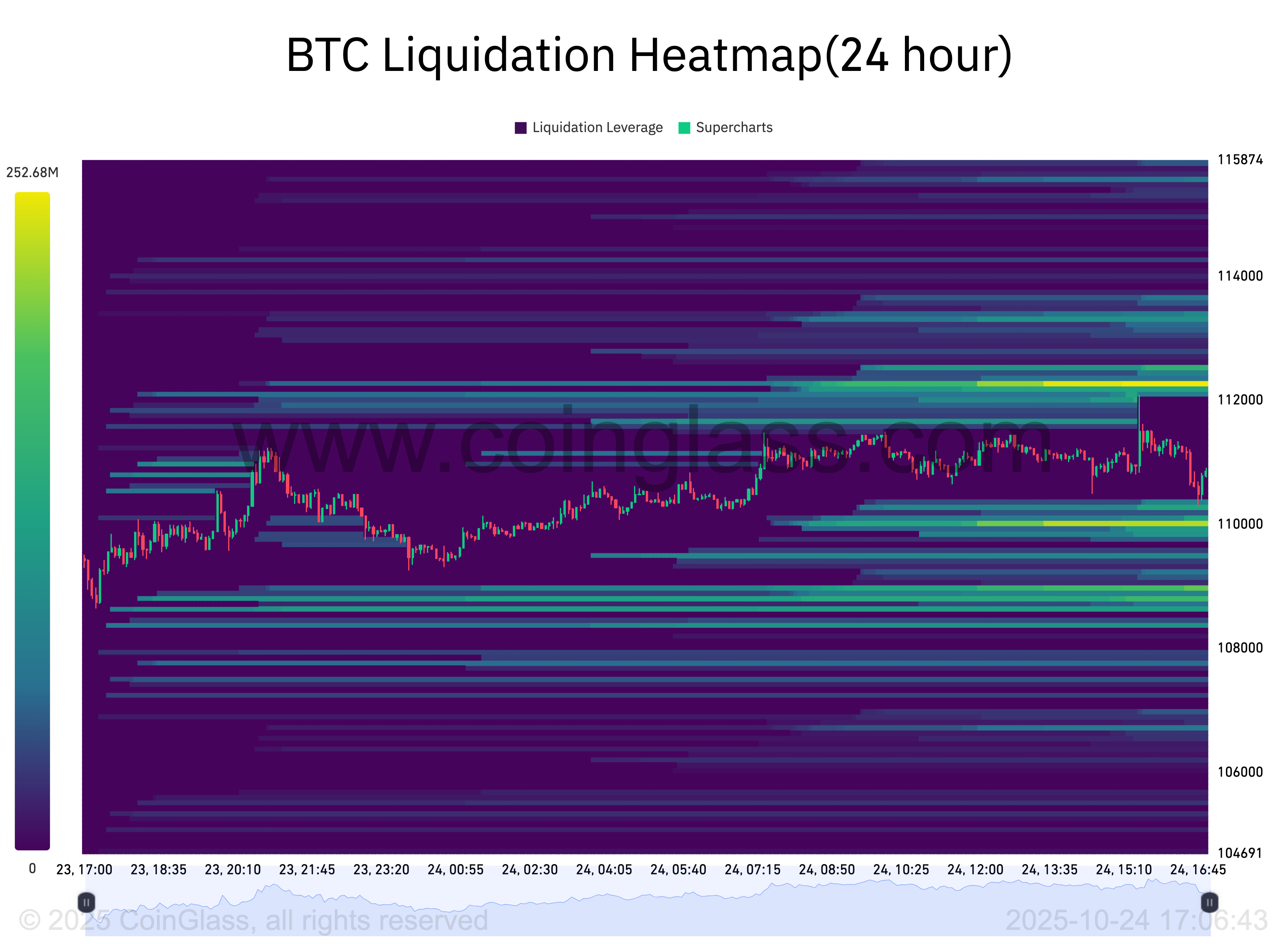 Аналитик Диего Уайт описал ситуацию в ордербуках бирж как «тяжелую». По данным CoinGlass, цена приблизилась к новой ступени заявок на покупку в районе $110 000.