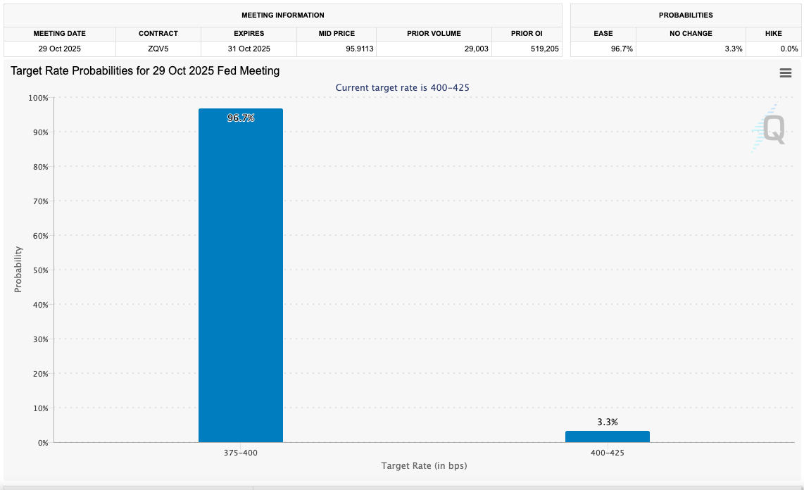Согласно данным Чикагской товарной биржи (CME Group), рынок практически единодушно ожидает их снижения на 0,25% 29 октября.