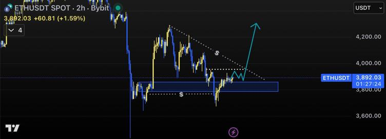 Техническая структура предполагает, что ETH торгуется в фазе сжатия между $3750 и $4100, где прорыв в любом направлении может привести к сильному росту волатильности.