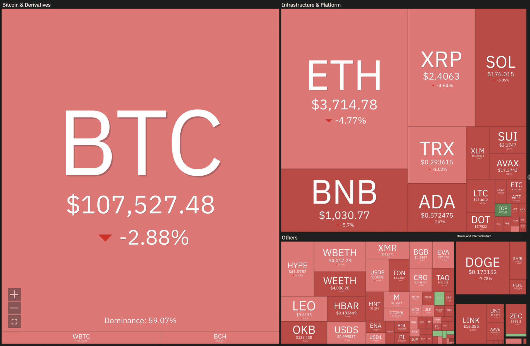 According to CoinMarketCap, Bitcoin was last changing hands near $107,482, down 2.85% over the past 24 hours. The move wiped out leveraged positions across exchanges, resulting in over $463 million in liquidations, according to Coinglass data.