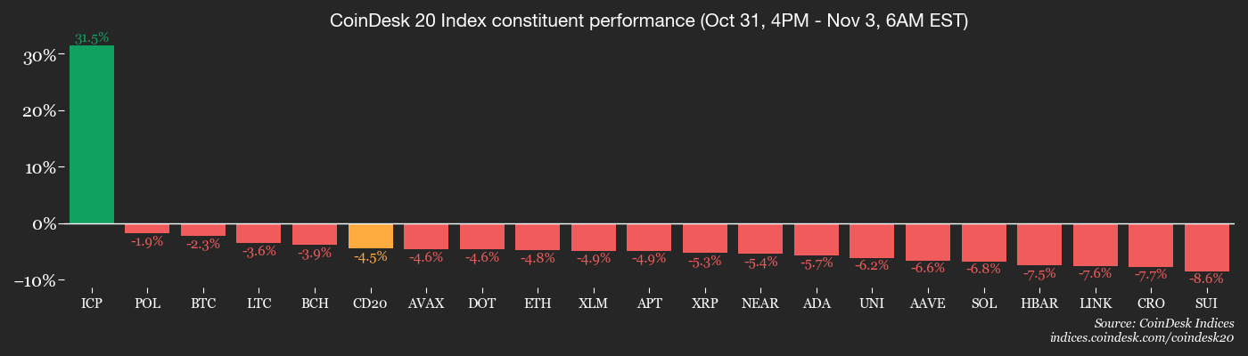 The crypto market remains under pressure and falling in October. Bitcoin BTC$108.263,01 has dropped 3% to $107,500 in the past 24 hours, while ETH, XRP, BNB and SOL have seen even bigger losses. The CoinDesk 20 Index fell more than 4%.