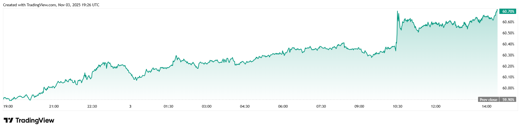 Twenty-four-hour trading volume jumped noticeably by 104.22% to $68.24 billion, which is significant even if the expected post-weekend surge is accounted for. But the large increase appears to have been primarily caused by unusually low volume on Sunday. Bitcoins total market capitalization fell alongside price to $2.13 trillion, but bitcoin dominance surged to 60.70%, an uncharacteristic 1.26% jump. The large shift hints at a struggling altcoin market.