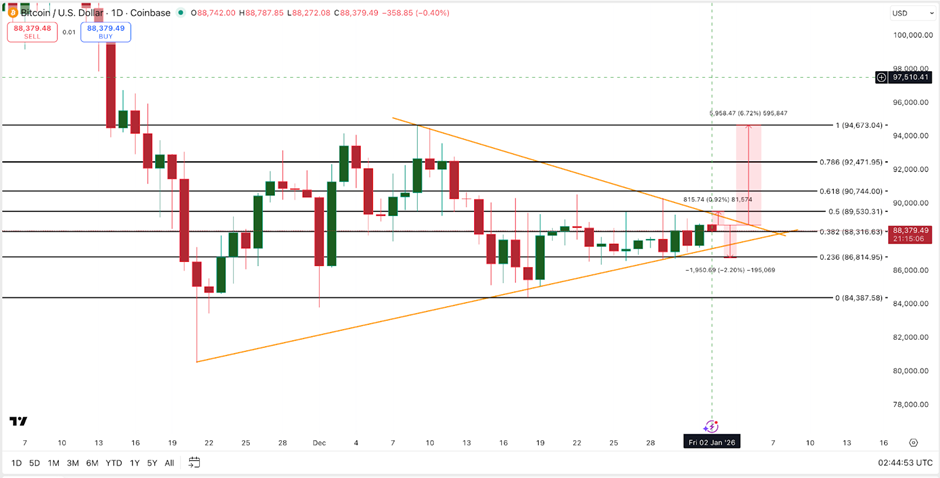 This development comes as Bitcoin reached $91,700 over the weekend, following a weekly price gain of 4.02%. BTC ended 2025 below the $90,000 level at $88,731, representing roughly a 30% decline from its all-time high.