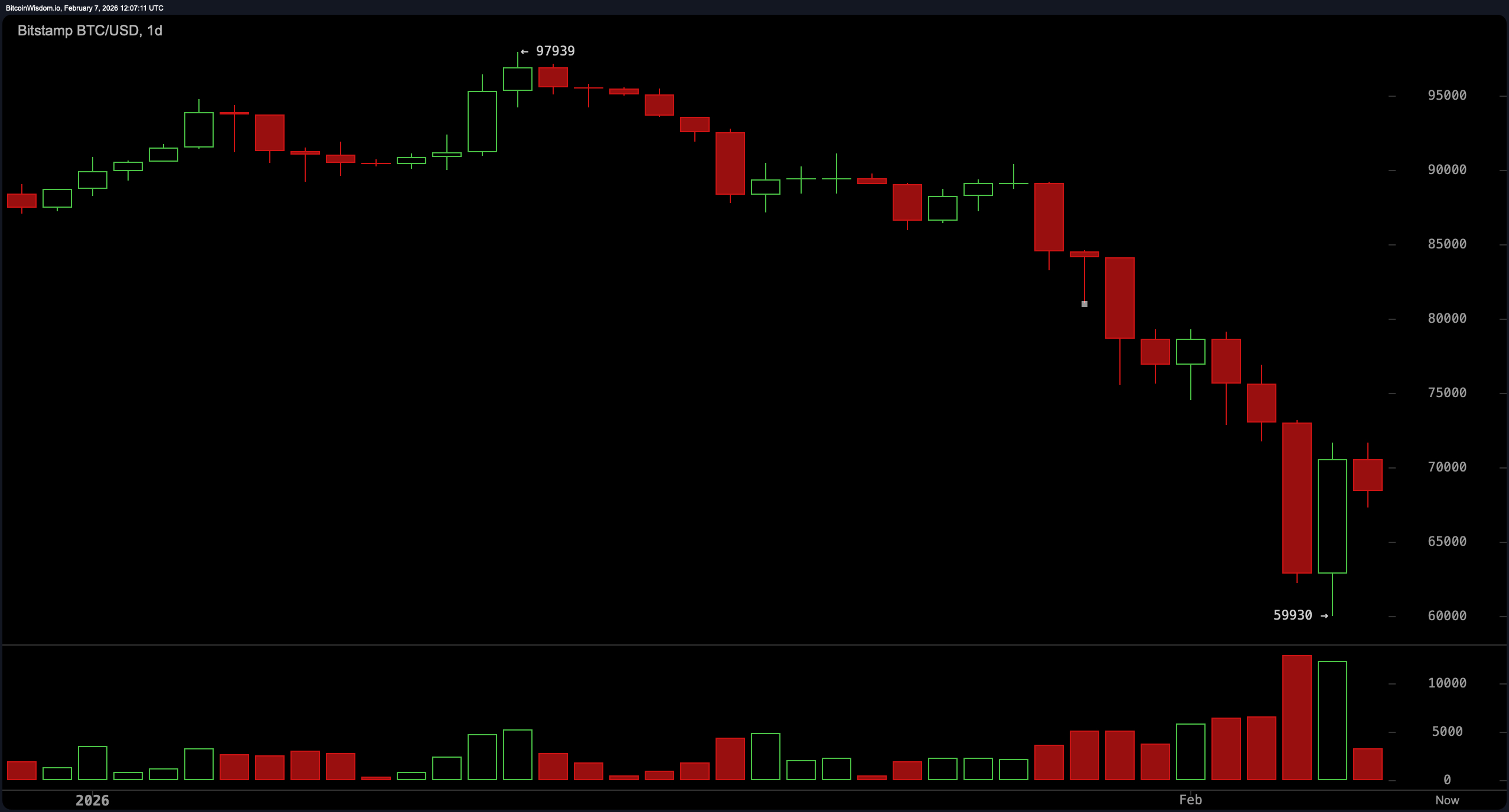 On the daily chart, bitcoin continues to respect a clearly defined downtrend that began after the failed push near the $97,900 peak and culminated in a sharp capitulation wick to $59,930. The subsequent rebound looks more like a reflex than a revival, with volume surging during the flush and fading on the bounce. That sequence typically signals panic followed by stabilization, not trend reversal. Until price can reclaim and sustain levels north of $75,000, the broader structure remains corrective, no matter how convincing the short-term enthusiasm tries to sound.
