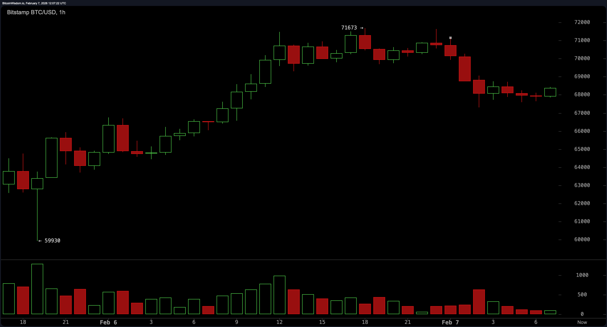 The one-hour chart sharpens that picture, showing a short-term uptrend from the capitulation low that stalled at $71,673 before rolling into lower highs. Price is now oscillating tightly around $68,000 to $69,000, a sign of intraday balance rather than conviction. Support rests near $67,500 to $68,000, while resistance looms between $70,500 and $71,700. This kind of compression often precedes expansion, and the lack of volume suggests traders are waiting, watching, and side-eyeing every tick.